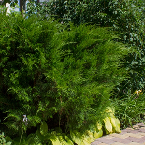 Широкий раскидистый кустарник. Крона плотная, волнообразная с дуговидно-изогнутыми побегами, кончики которых слегка повисают. Хвоя ярко-зелёная, чешуевидная, внутри кроны встречается игловидная, острая, голубоватая. Растет быстро.
