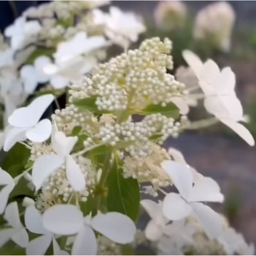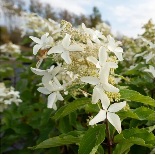 Соцветия длиной до 50 см имеют форму узкой пирамидки и состоят из стерильных и фертильных цветков. Стерильные цветки крупные, диаметром 6-8 см, белые, ароматные. Неприхотлива. Рекомендуется сильная обрезка весной до начала сокодвижения. Не любит полива по листьям и цветкам.