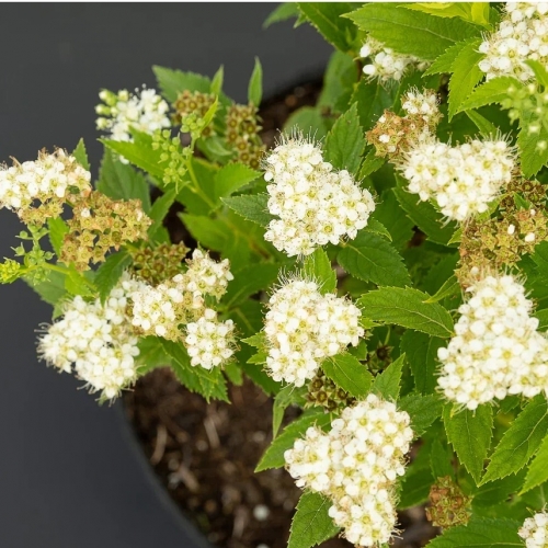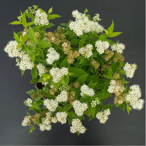 Красивоцветущий низкий кустарник с упругими прямыми побегами. Крона компактная, ажурная до 1,5 м шириной. Листья ланцетные, до 7 см длиной. Цветки белые, в крупных, плоских щитковидных соцветиях. Цветение продолжительное. Неприхотлива.
