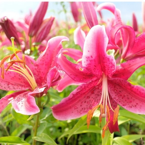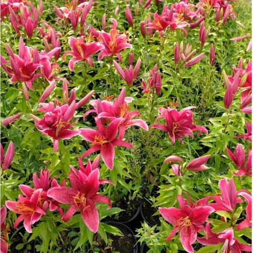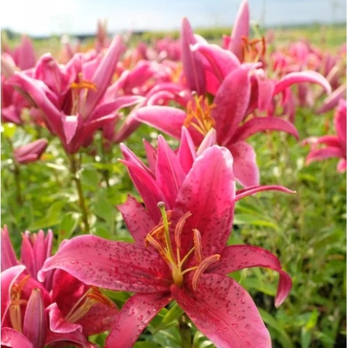 Восточная. Мощная лилия до 100см. Цветок крупный, до 20 см, лепестки розово-малиновые, с крапом и тонкой светлой каймой, гофрированные. Аромат сильный. Пригодна для срезки.