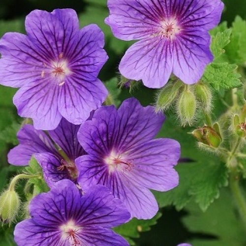 Листья на черешках, мягкие, бархатно-опушенные, с зубчатыми краями, рассеченные на 5 долей, сизо-зеленые, осенью раскрашиваются всеми оттенками красно-оранжевого. Цветки крупные, до 5см, лилово-синие с темно-фиолетовыми прожилками и лилово-розовым зевом. Цветение исключительно обильное.