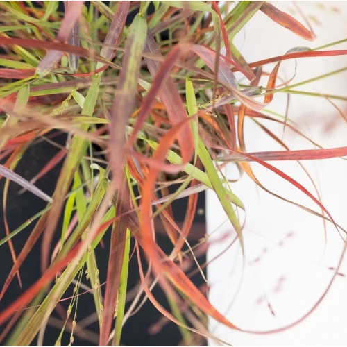 Листья зеленые, к осени окрашиваются в красно-бордовые тона. Стебли практически никогда не наклоняются и не изгибаются, даже во время сильных дождей; высотой 1,3–1,5 м с метелками. Цветет обильно,образуя целое облако из колосков. Солнце, полутень