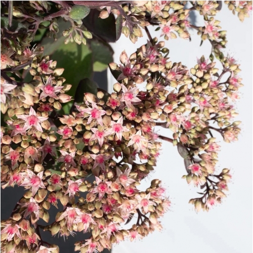 Высокий сорт с прямостоячими побегами вишнёвого цвета. Молодая листва окрашена в сизо-зелёный цвет, но благодаря тонким красным жилкам, она приобретает розоватый оттенок. Мелкие звёздчатые цветки собраны в крупные бело-розовые соцветия. Цветение с конца лета до заморозков. Засухоустойчив.